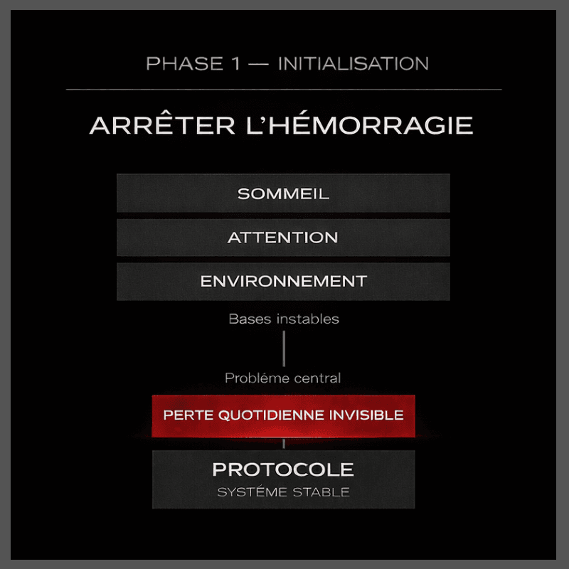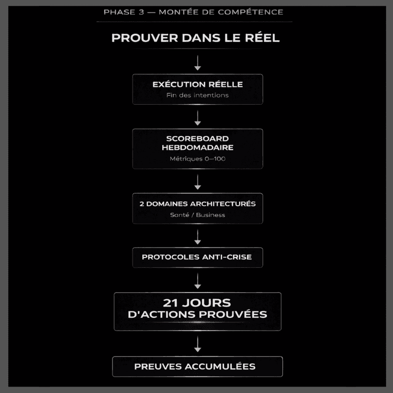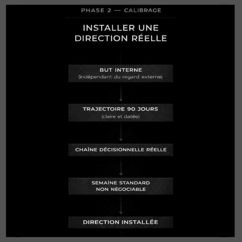 Pas de motivation. Pas de "mindset". Juste de la structure. On construit ta Chaîne Décisionnelle Réelle (Conséquence → Critère → Hiérarchie → Action). On confronte ton flou. On installe des métriques. On rend tes actions directionnelles. Et tu deviens fiable.