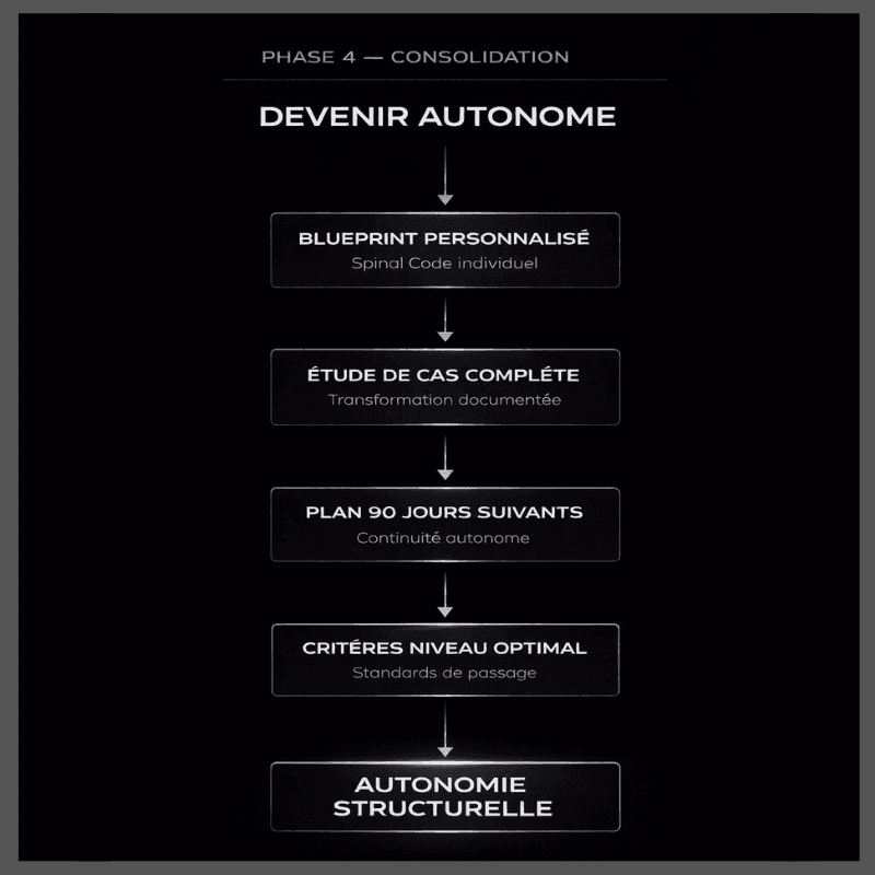T'es fonctionnel. T'as une structure autonome. Tu peux continuer seul ou, si tu veux évoluer vers Optimal, il y aura une offre future (pas encore disponible). Mais Spinal Code 90 te rend fonctionnel. Pas dépendant.